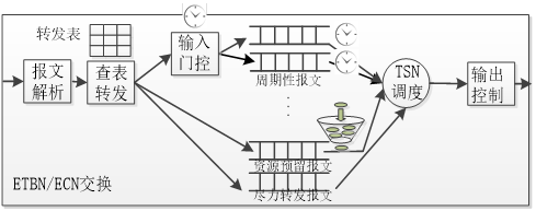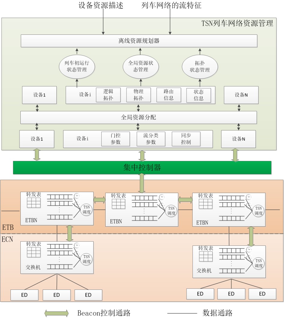 TSN與ETB、ECN結(jié)合主要是通過將TSN的時間同步、802.1Qch的周期性調(diào)度算法以及令牌桶的算法與當前以太列車ETB、ECN技術(shù)相融合,通過集中控制方式在列車初運行完成后對列車網(wǎng)絡中的各ETBN以及ECN交換節(jié)點進行集中管理控制以及統(tǒng)一的資源規(guī)劃管理,以實現(xiàn)對列車通信網(wǎng)絡中各業(yè)務流的精確控制以及確定轉(zhuǎn)發(fā)的功能。
