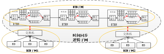 圖2所示,在以太列車網(wǎng)絡中,ETB的骨干網(wǎng)絡為一個獨立的子網(wǎng),各ECN網(wǎng)絡也為一個獨立的子網(wǎng)。通過報文解析模塊以及輸出調(diào)度模塊的控制,可以使的ETB子網(wǎng)與ECN子網(wǎng)1以及ECN子網(wǎng)2成為一個虛擬的時間同步的邏輯子網(wǎng),并實現(xiàn)不同子網(wǎng)間的時間同步功能。