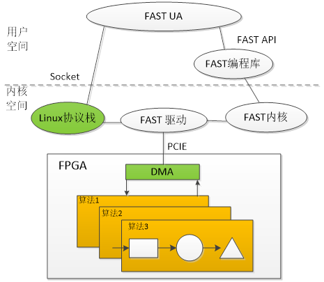 本方案是基于FAST的軟硬件架構實現,如圖1所示,軟件用戶程序可以通過簡單的程序接口即讀寫命令實現與FPGA加速算法的數據通信。基于FPGA硬件并行的處理特點,在算法實現時可以同時并行運行多種不同的實現算法,已達到多應用并行處理的需求。另外,在硬件實現單算法時,根據算法的功能特點可以將算法進行流水化或并行化處理,從而加速數據處理效率。