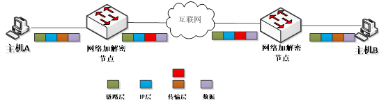 如圖1所示,對主機A與主機B間的TCP的通信進行加解密處理。即主機A的TCP數據通過網絡加密結點對其TCP數據加密后傳送給網絡,數據包經互聯網傳送給主機B端的網絡加解密結點進行解密處理,處理后的數據送給主機B 。反向同理。