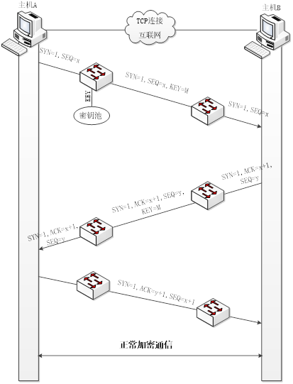 在TCP建立連接時,網絡加解密結點會監測,輸入報文是否主SYN的報文,若是,則從密鑰池中隨機申請一個密鑰(KEY),將密鑰信息隨建立連接的報文發送給接收端,接收端接收密鑰信息,在接收到連接響應報文時,將確認的密鑰信息再返回給發送端,以確認其已經正確協商密鑰可以正常通信。