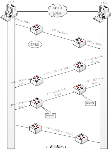 在TCP結束連接時,當結束發送端(主機A)發送FIN報文時,網絡加密結點先不立刻注銷密鑰信息,而是等待主機B發送結束時才注銷密鑰信息,因為主機A在申請結束連接時,主機B可能還會向主機A發送TCP的數據,因此,需要等待主機B也發送結束報文時才進行密鑰的注銷。