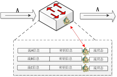 密鑰池為網絡加密結點內部存儲的密鑰的集合,密鑰池內有多種密鑰,為了保證通信的安全性,在每條TCP流進行通信時,都會選用不同的密鑰進行加解密處理。從而可以更細粒度的保證每條TCP數據流的安全性。