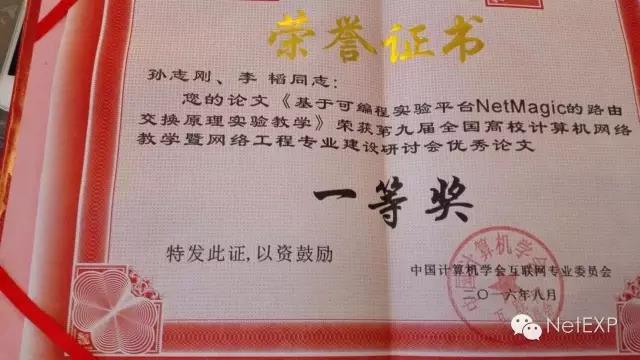 在此次教學建設研討會上,國防科學技術大學的孫志剛和李韜老師的論文《基于可編程實驗平臺NetMagic的路由交換原理實驗教學》獲得了優秀論文一等獎,說明了網絡實驗教學的新方向的發展獲得了業界老師們的一致肯定。