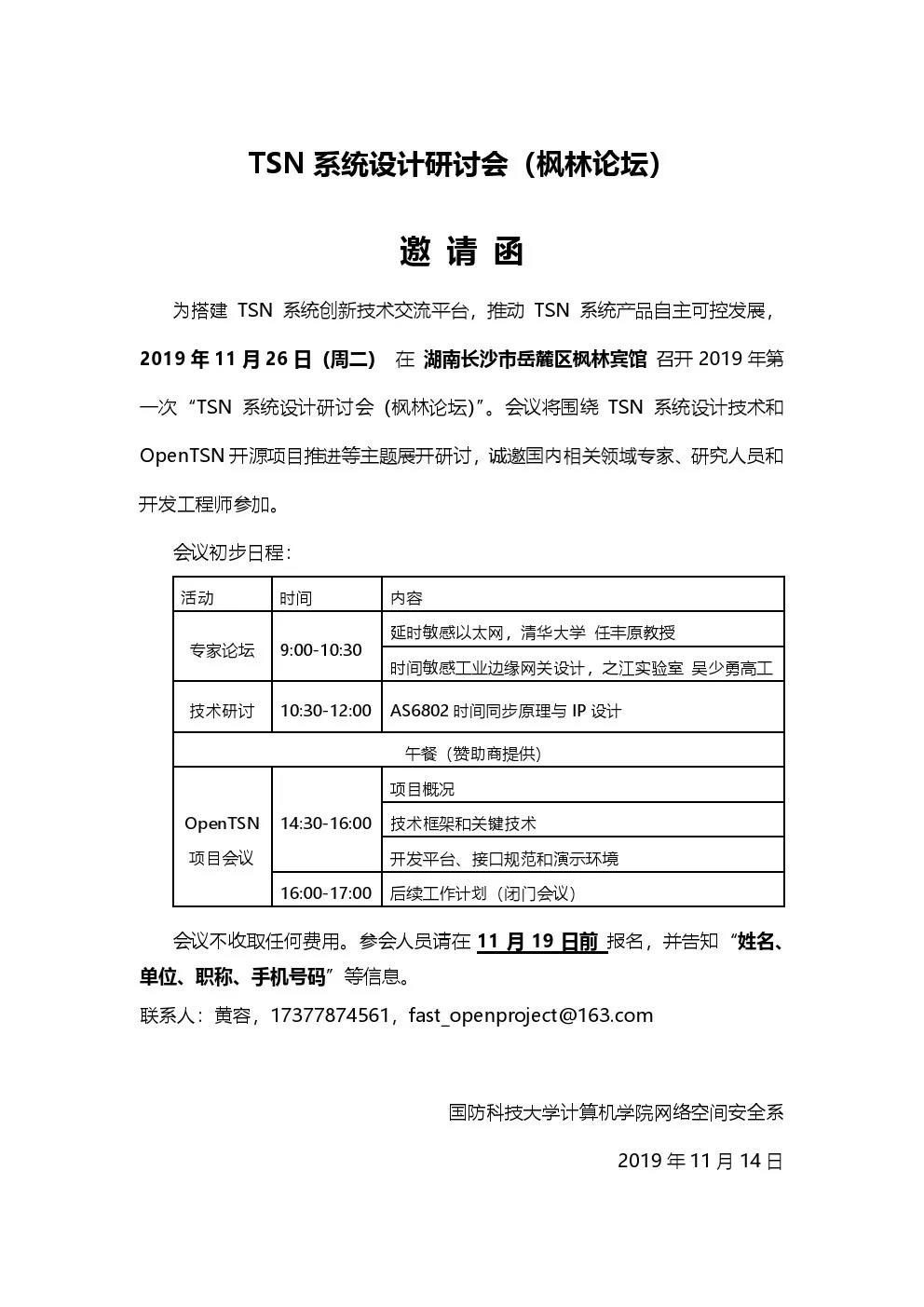根據專家建議,“OpenTSN項目研討會”更名為"TSN系統設計論壇(楓林論壇)",內容由只討論OpenTSN項目擴充到TSN系統設計的各方面。論壇將定制舉行,希望在大家支持下,能為推動TSN系統產品自主可控發展做出貢獻。