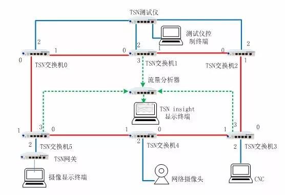 其中6個Openbox-S4配置成4端口TSN交換機,并組成一個環(huán)形TSN網(wǎng)絡。另外3個Openbox-S4分別實現(xiàn)TSN測試儀、流量分析器和TSN網(wǎng)關功能。4個Linux終端分別運行TSN網(wǎng)絡的CNC軟件,Insight軟件(TSN網(wǎng)絡內部狀態(tài)觀測分析),TSN測試儀控制軟件和攝像頭視頻顯示軟件。