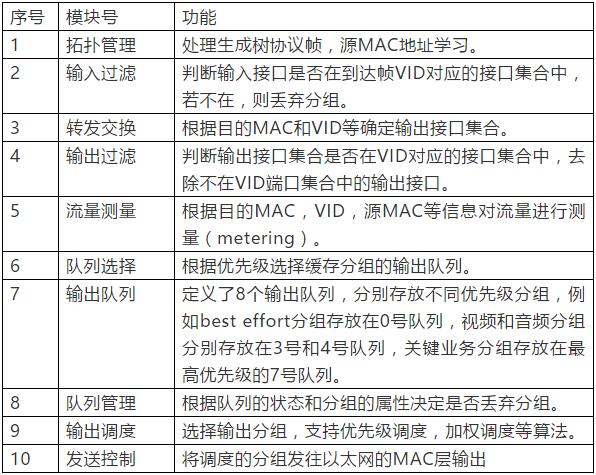 802.1Q-2014定義了標準以太網(wǎng)的交換流程,如下圖所示。處理流程主要包含10個模塊,每個模塊的功能見下表。