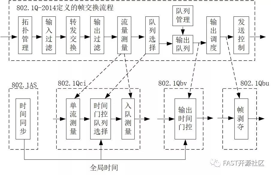 針對確定性交換的目標,TSN主要在時間同步(802.1AS)、單流的過濾和管控(802.1Qci,Per-Stream Filtering and Policing),時間敏感流量的調度(802.1Qbv Enhancement for scheduled traffic)以及幀剝奪(802.1Qbu)四個方面對標準以太網(wǎng)交換流程進行增強,除了時間同步標準外,其他三個標準都成為802.1Q的修訂,并合并到最新的802.1Q-2018中。