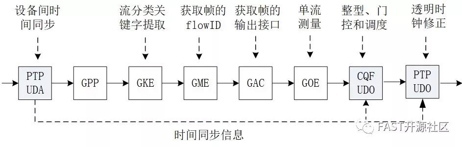 FAST基本流水線包含協(xié)議解析(GPP),關鍵字提取(GKE),匹配查表(GME),通用動作(GAC)和通用輸出控制(GOE)五個基本的模塊,可為TSN交換提供基本的分組處理功能。而時間同步,以及流的測量整型、時間門控和輸出調度邏輯分別由用戶定義的PTP UDA、CFQ UDO和PTPUDO模塊實現(xiàn),如下圖所示。