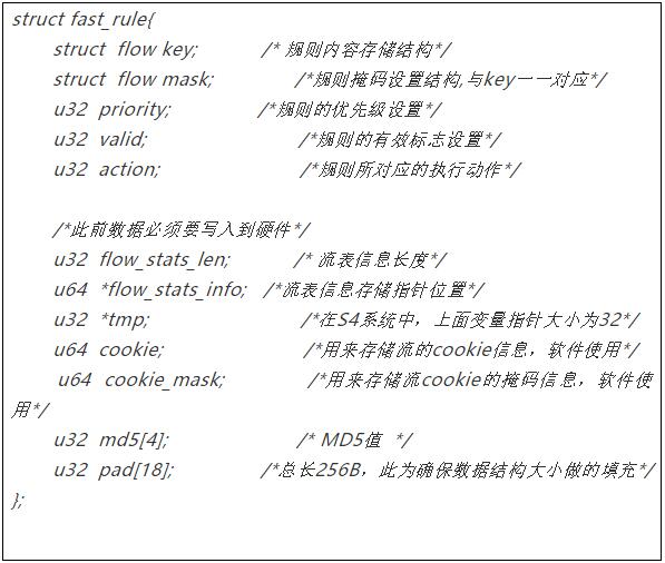 由于SDN轉發面的管理主要是對規則進行增加,刪除等操作,因此FAST定義了Fast_rule數據結構,如下所示。因此UA在編程實現SDN的規則管理時,只需要實現對上述規則的操作即可,而不需要考慮規則的具體存儲地址。我們會在基于FAST的SDN交換實現相關文檔中詳細介紹Fast_rule數據結構。