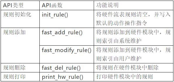 基于Fast_rule數據結構,可以為SDN規則管理定義如下5個擴展的API。分別實現規則表的初始化、規則添加、規則刪除和規則打印等功能,如下表所示。
