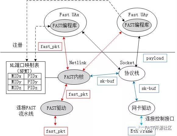 FAST平臺軟件實現示意如下圖所示,其中包含FAST驅動、FAST內核、FAST編程庫以及兩個UA、UAx和UAy。FAST內核維護的Netlink端口映射表NPMT(Netlink Port Mapping Table)是FAST平臺軟件中的核心數據結構,主要存放UA的MID與NetLink端口號之間的映射關系。