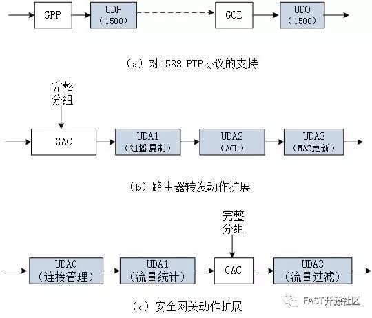 通過對(duì)FAST硬件流水線進(jìn)行擴(kuò)展,可以支持在原有的交換平臺(tái)中擴(kuò)充支持新的協(xié)議以及新的分組處理機(jī)制。例如下圖分別介紹了通過擴(kuò)展UDP和UDA模塊支持IEEE 1588,L3轉(zhuǎn)發(fā)控制以及安全網(wǎng)關(guān)功能的例子。