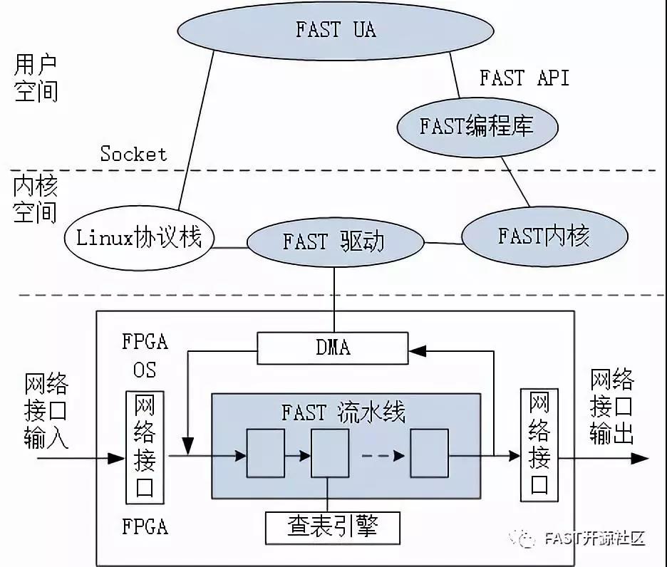 FAST UA實現(xiàn)用戶定義的分組處理功能,如與外部SDN控制器連接的OpenFlow通道,軟件實現(xiàn)的新型轉(zhuǎn)發(fā)交換(如LISP、段路由等)以及各類有狀態(tài)Middlebox功能等。FAST流水線中的硬件模塊可以通過查表決定直接轉(zhuǎn)發(fā)分組或者把分組重新定向到特定的軟件UA上。