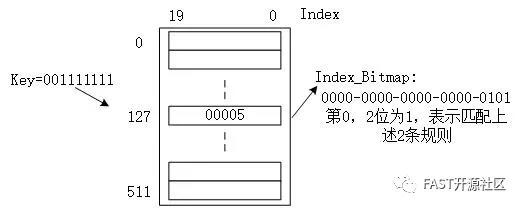參照圖2,圖2為流表匹配域的存儲結構圖,其為512*20的RAM存儲塊,在此可視為512*20的二維數組,其中行地址512個,為匹配域關鍵字(Key)字段;列地址為20個,為規則索引字段(Index)。圖2將9位的Key作為地址查找RAM(Key=00111_1111),查找出的結果為此關鍵字段命中的20條規則的索引標識位(Index_Bitmap)為0_0005,其中第0,2,位為1,表示該key匹配了上述2條規則。由于0為高優先級位,因此0號索引被輸出。
