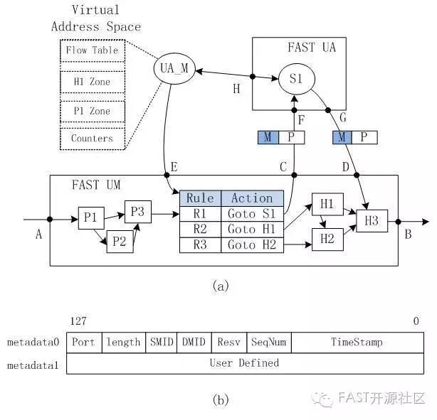 FAST通過兩種機制實現軟硬件處理的協同。一是將軟硬件處理模塊統一編址,為每個action模塊分配統一的MID(Module ID)。例如圖3(a)中三個硬件action模塊(H1、H2和H3)和一個軟件功能模塊(S1)都會分配一個唯一的MID。流表可以按照匹配結果將一個報文顯示的分派到指定的軟件或者硬件功能模塊。二是軟硬件分組通信時同時攜帶32字節的metadata。Metadata的定義如圖3(b)所示。