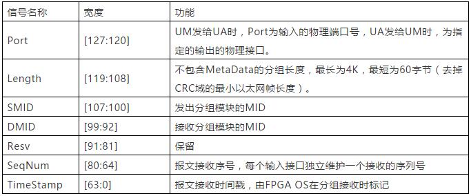 FAST規范顯式定義了Matadata的前16字節(Metadata0),如表1所示。通過Matadata,FPGA UM可將報文接收的端口、長度、接收的精確時間和序列號,以及發出的硬件模塊,目的軟件模塊等信息送給軟件,平臺相關軟件根據DMID信息將其送給指定的用戶UA程序。用戶UA程序處理完分組后,又可通過Metadata信息將其送給指定的硬件模塊,也可直接指定目的輸出接口(輸出調度器也通過DMID指定)。