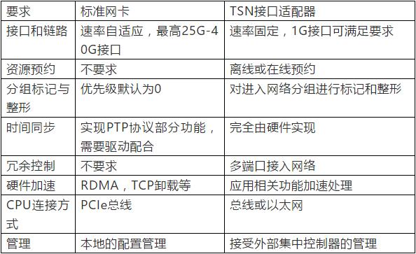 TSN網(wǎng)絡接口適配器與標準網(wǎng)卡的比較如下表所示。
