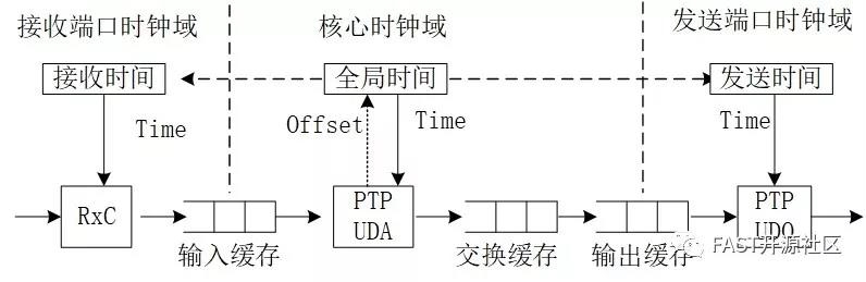 時(shí)間同步是TSN交換實(shí)現(xiàn)的前提。802.1AS規(guī)范定義了TSN網(wǎng)絡(luò)同步的方法,其基本思路還是利用IEEE 1588v2定義的PTP協(xié)議,將網(wǎng)絡(luò)中所有的時(shí)間從設(shè)備與時(shí)間主設(shè)備的時(shí)間進(jìn)行同步。在基于FAST流水線的TSN實(shí)現(xiàn)中,與PTP協(xié)議相關(guān)的邏輯主要有接收控制邏輯(RXC),PTP-UDA模塊以及PTP-UDO模塊。這三個(gè)模塊密切協(xié)同實(shí)現(xiàn)PTP時(shí)間同步而不需要軟件參與。