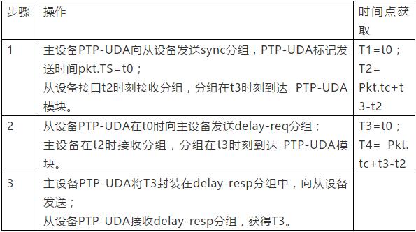 時(shí)間從設(shè)備與時(shí)間主設(shè)備的交互并獲取四個(gè)關(guān)鍵時(shí)間點(diǎn)的詳細(xì)方法如下表所示,時(shí)間點(diǎn)標(biāo)記參見圖2。